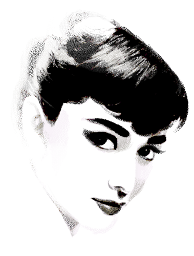 It was easy to find inspiration for her portrait in Yousuf Karsh's photograph from 1956, used with permission from the estate of Yousuf Karsh. The black and white image is graceful and understated yet immediately recognizable. Taking cues from Audrey's movie posters and work with charities, I added a graphic splash of pink and figures of her dancing with and embracing children.