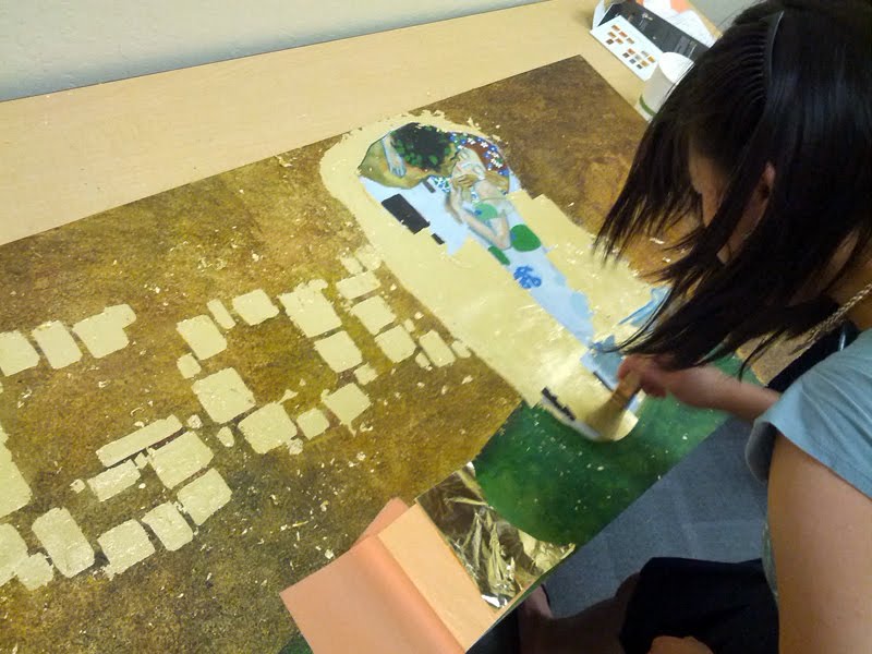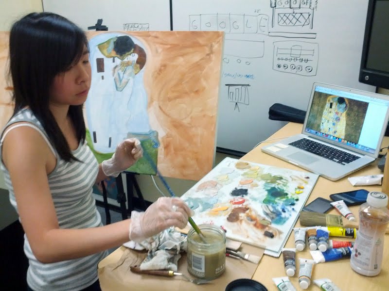 The doodlers and I have waited for his big 150th birthday, so I knew that I had to brighten up the homepage in his iconic style. Using (faux) gold leaf and oil paint, I wanted to pay homage to Klimt with his most famous painting, "The Kiss." I hope that our humble doodle does his brilliant legacy some justice! Below are some photos my coworkers snapped while I painted in one of our offices(-turned-studio).