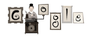 Hisashige Tanaka was a great inventor, born in what is today called Fukuoka Prefecture in Japan on October 16th, 1799. Tanaka’s prolific career began in his youth, when he famously engineered a set of handmade karakuri dolls; small, mechanized figurines capable of performing simple tasks, such as shooting a bow and arrow, receiving an empty teacup and returning with a filled one, and writing calligraphy with a miniature brush and inkstone. I was immediately taken by the elegance of the karakuri, and set about developing a sketch in which the calligraphy writing doll completes the Google logo by painting an ‘o’ upon his canvas.