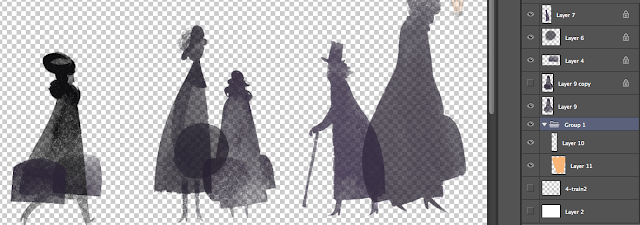 I sketched the chosen scenes digitally, then after a few revisions and adjustments went over them with brush and ink on layers and layers of paper. I then created a color scheme and assembled all these bits into digital layers that we arranged to move at varying speeds across the stage.