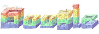 Considering Steno's contributions to stratigraphy and geology, I wanted to honor his birthday with a unique take on his work. I knew that the colorful and geeky aesthetic of stratigraphy was the right direction for the doodle, but the team and I weren't sure how to apply it. Should we set the doodle in the middle of the country? Should we relate it to Google culture? Should I just make things up? Below are the exploration sketches.