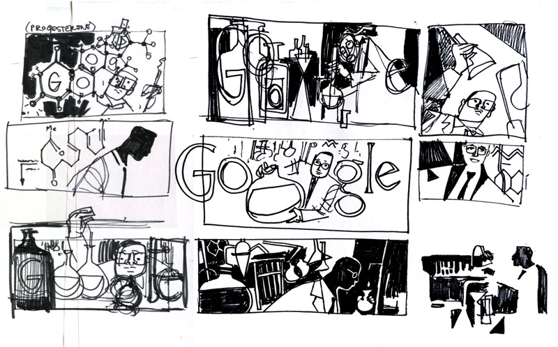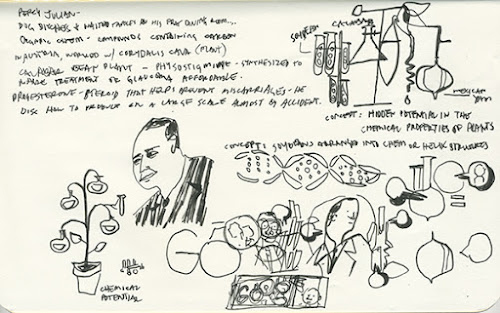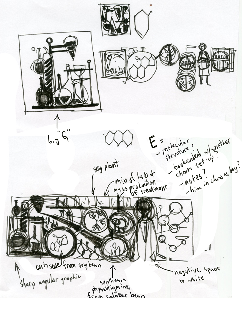 Visually, I was presented with a familiar challenge: to create something fun and engaging for us non-science types (I confess to finding a way of skipping chemistry in high school), while still calling attention to Julian's key achievements in an appropriate (ie. correct and validated!) way. Before getting too far into the research, I sketched thumbnails of the common association – that of a chemist in a lab full of beakers and tubes: