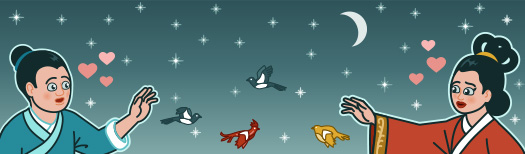 In the lunar calendar, the seventh day of the seventh month (or August 13th in this year’s standard calendar) is a time to celebrate a great, romantic love story. The names and traditions vary from country to country, but all the celebrations can be traced back to an old story of two lovers who are separated by a great river and are forbidden to meet except for this one night. Their reunion is always made possible with the help of some very sympathetic bridge-building magpies (or crows). The male character in the story is usually a handsome, mortal shepherd. While the female character is always a beautiful, heavenly weaver and the daughter of the gods.
