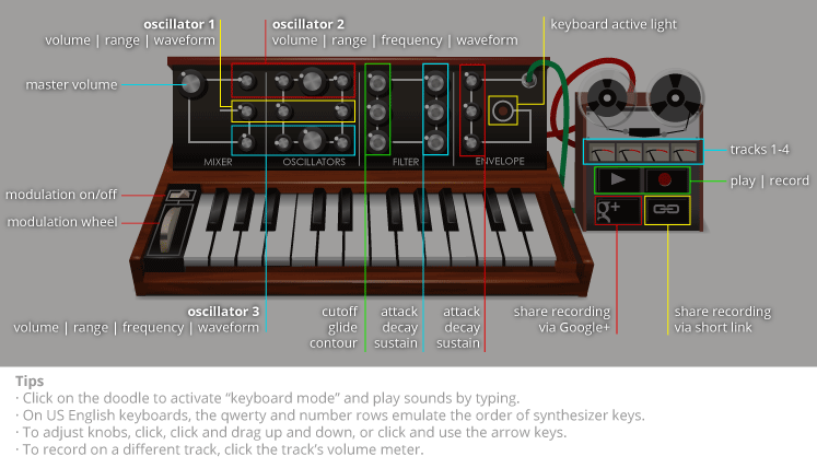 Much like the musical machines Bob Moog created, this doodle was synthesized from a number of smaller components to form a unique instrument. When experienced with Google Chrome, sound is generated natively using the Web Audio API—a doodle first (for other browsers the Flash plugin is used). This doodle also takes advantage of JavaScript, Closure libraries, CSS3 and tools like Google Web Fonts, the Google+ API, the Google URL Shortener and App Engine.